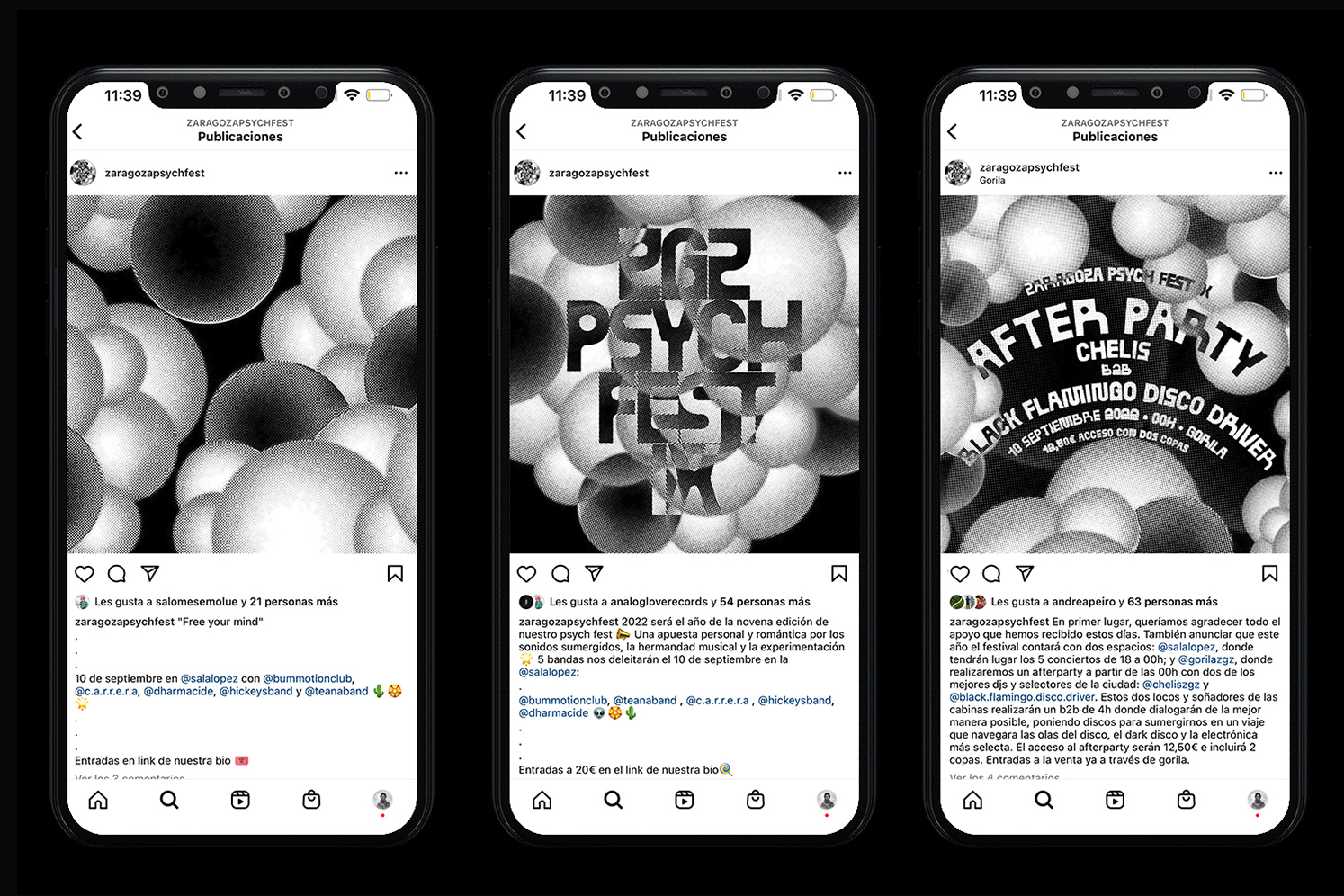 THE GRAPHIC IDENTITY FOR ZGZ PSYCH FEST IX IS INSPIRED BY THE SHAPES AND TEXTURES OF BUBBLES, WHICH HAVE AN ETHEREAL AND EPHEMERAL QUALITY THAT EVOKES THE CONSTANTLY EVOLVING AND CHANGING NATURE OF PSYCHEDELIA. A PSYCHEDELIC AND ETHEREAL JOURNEY. AN ADAPTABLE AND SCALABLE IDENTITY FOR USE IN DIFFERENT MEDIA AND PLATFORMS.