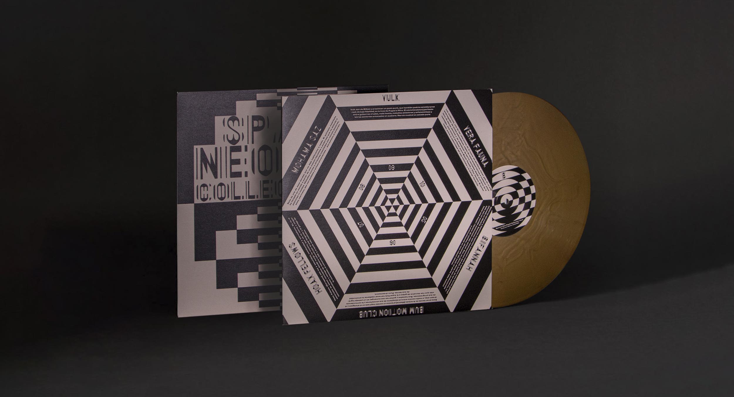 BLACK AND WHITE GEOMETRIC OP ART SHAPES ARE THE GRAPHIC IDENTITY FOR THE SECOND VOLUME OF THE SPANISH NEO-PSYCH COLLECTION. A VISUALLY STRIKING AND DYNAMIC EFFECT. TRYING TO GENERATE A PERCEPTUAL EXPERIENCE RELATED TO HOW VISION WORKS. AN ATTRACTIVE VISUAL EXPERIENCE AT THE SAME LEVEL AS SOUND.